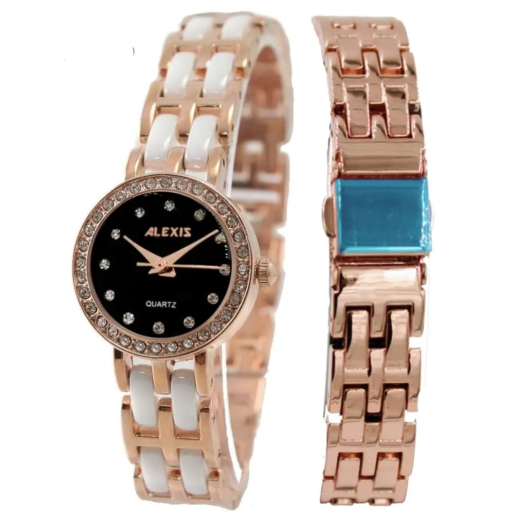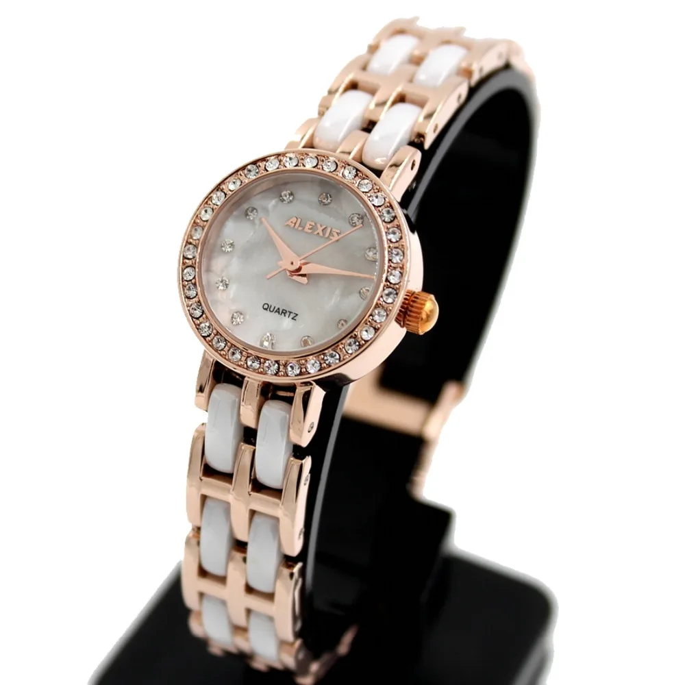 HIGH QUALITY Alexis Women Fashion Analog Quartz Round Watch Japan PC21J Movement Rose Gold with Shiny Metal Band